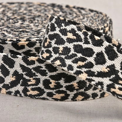 Sangle léopard, fond uni blanc légèrement écru, avec des taches noir et beige, qui s'inspire très bien du pelage du léopard. Sangle esprit safari, parfait pour une anse ou une bandoulière de sac, ou pour la réalisation d'une banane. Ce motif animalier tendance apporte une touche mode irrésistible, idéale pour des projets couture uniques. Sa composition en polyester assure une belle résistance avec le temps.