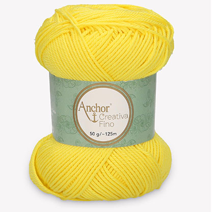 Créativa fino jaune, coloris jaune citron vif. en fil de coton mercerisé fin, idéal au crochet comme au tricot. Son rendu est très doux, et son aspect légèrement soyeux. Par sa torsade très régulière de 4 brins de fil de coton, il est résistant dans le temps, et il assure un rendu très régulier dans vos ouvrages. la gamme Créativa fino de Anchor répond à la norme OEKO-TEX 100, ce qui garantie des ouvrages adapté pour tout l'univers des bébés, layettes, comme jouets, qui peut se mettre directement sur la peau. Il est aussi respirant et hypoallergénique pour les saisons chaudes