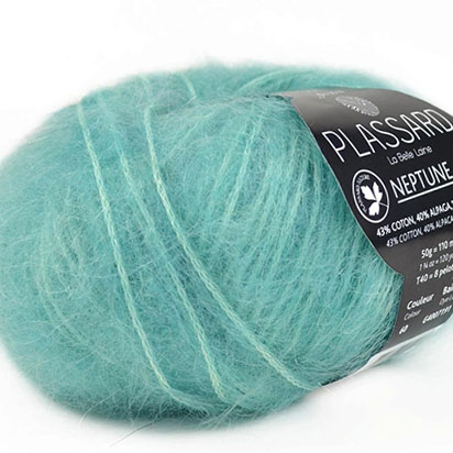 Laine Neptune turquoise, ton bleu turquoise clair, esprit bort de mer, idéal toute l'année par ce beau coloris et cette composition légère. Ce fil aérien, mélange de 43 % coton, 40 % alpaga et 17 % mohair, permet la réalisation de modèle été, comme hiver. Son effet volume, une tendance actuelle, est parfait pour un pull mode. La Maison Plassard propose quelques modèles, disponibles dans notre boutique parisienne A bout de fil.