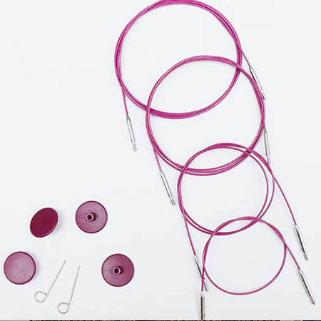 4 longueurs de câble, 40 cm, 60 cm, 100 cm ou 120 cm qui se vissent sur toutes les tailles d'aiguilles de chez Knit pro, du n°3 au n°10.